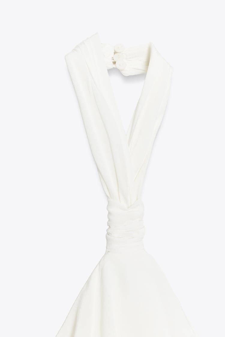 Мини-платье с воротником халтер и открытой спиной. Асимметричный низ. Боковая застежка-молния, потайная в шве, и пуговицы на шее.