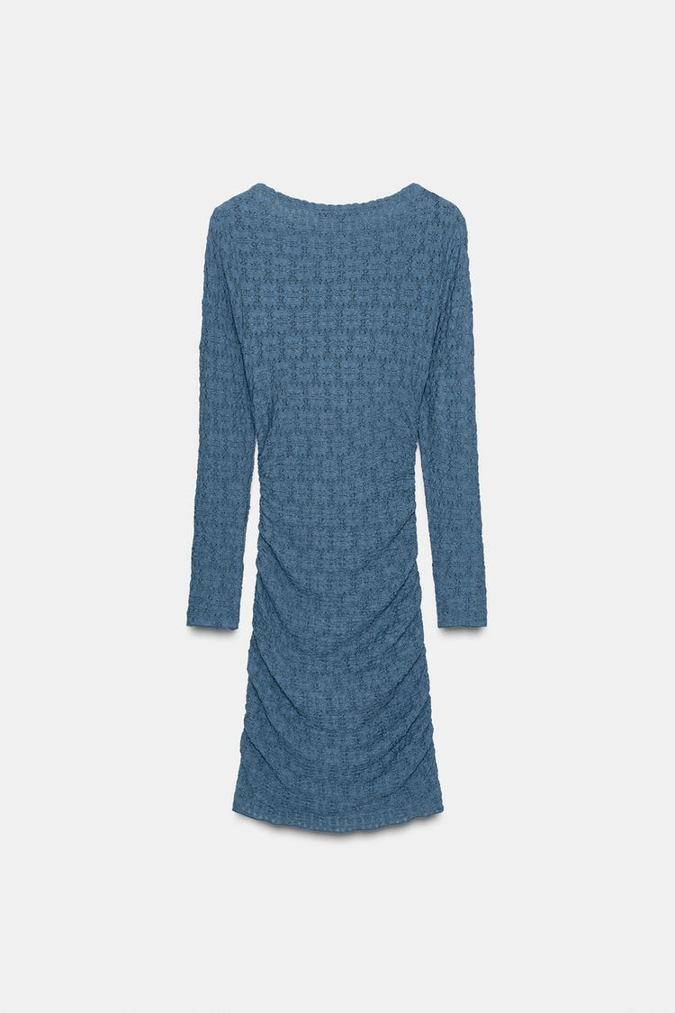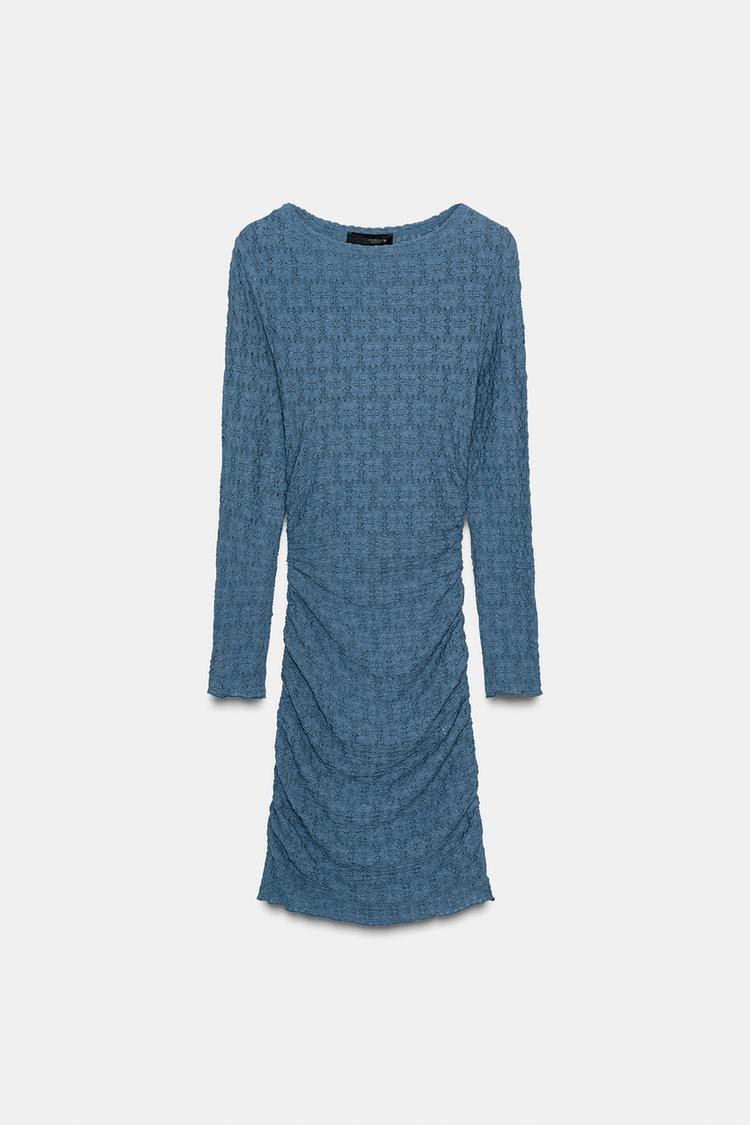 ZARA МИНИ-ПЛАТЬЕ СО СБОРКАМИ И ФАКТУРНОЙ ТКАНИ, СТАЛЬНОЙ СИНИЙ