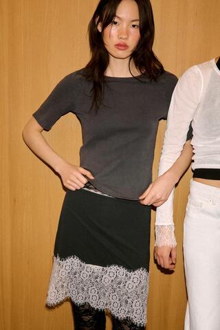 ZARA МИНИ-ЮБКА С КОНТРАСТНЫМ КРУЖЕВОМ, БЕЛЫЙ/СЕРЫЙ