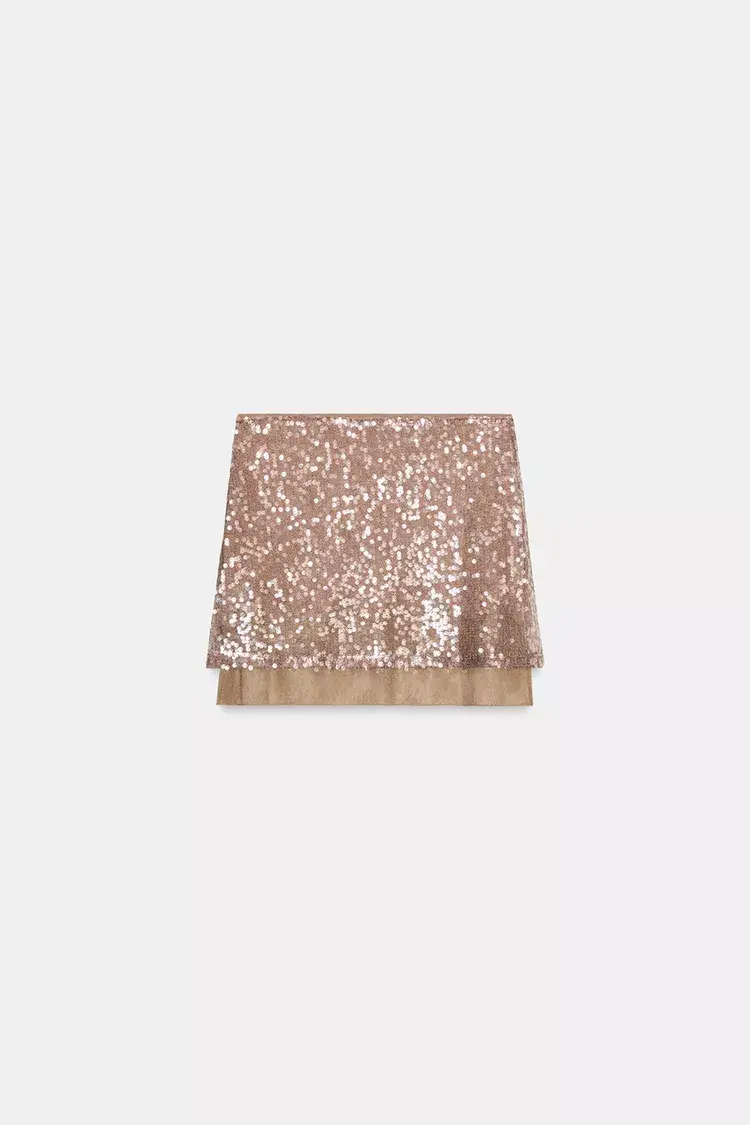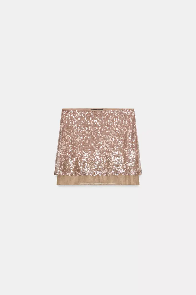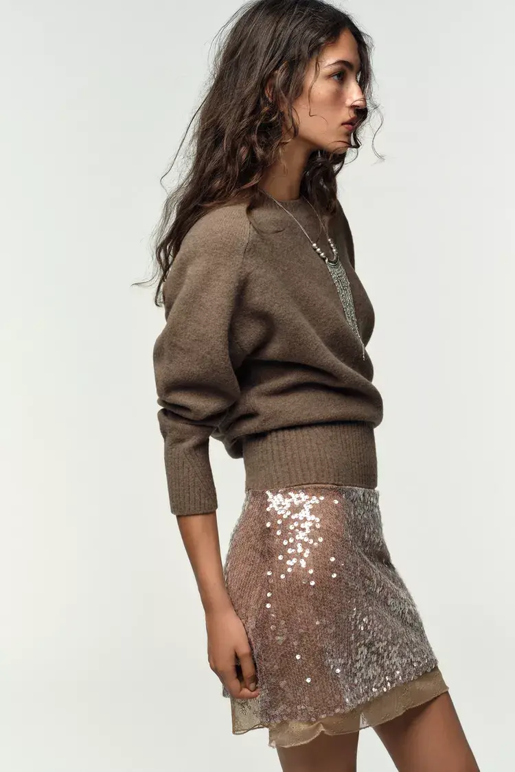ZARA МИНИ-ЮБКА С ПАЙЕТКАМИ, ТРИКОТАЖЕМ И КРУЖЕВОМ, СЕРО-КОРИЧНЕВЫЙ