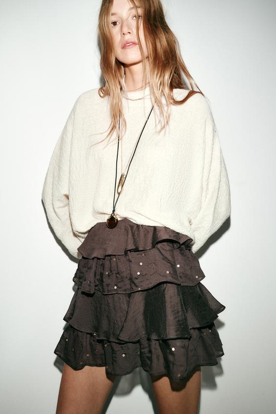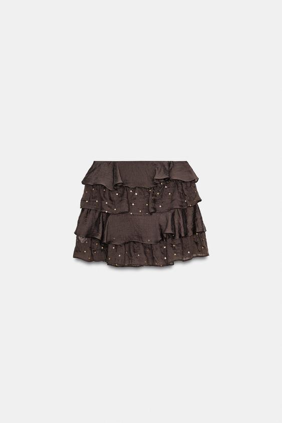 ZARA МИНИ-ЮБКА С ВОЛАНАМИ И ПАЙЕТКАМИ, КОРИЧНЕВЫЙ