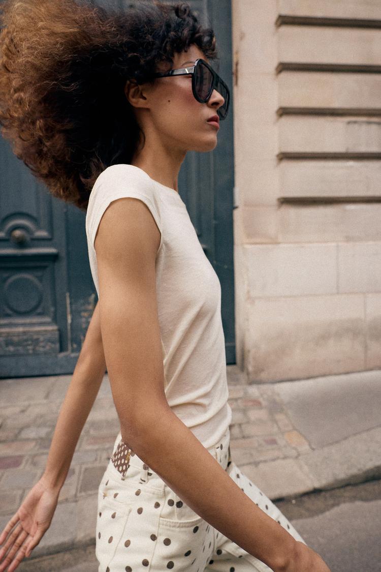 ZARA МИНИМАЛИСТИЧНАЯ ФУТБОЛКА С КОРОТКИМИ РУКАВАМИ, ВАНИЛЬНЫЙ
