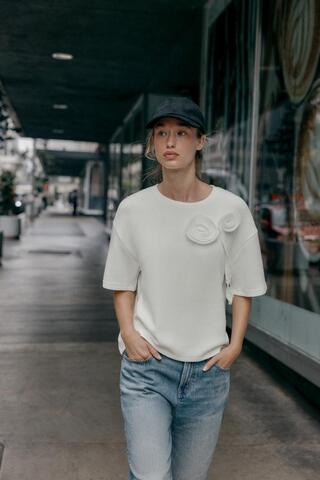Футболка с круглым вырезом и короткими рукавами. Рельефный цветочный принт спереди. Прямой низ.