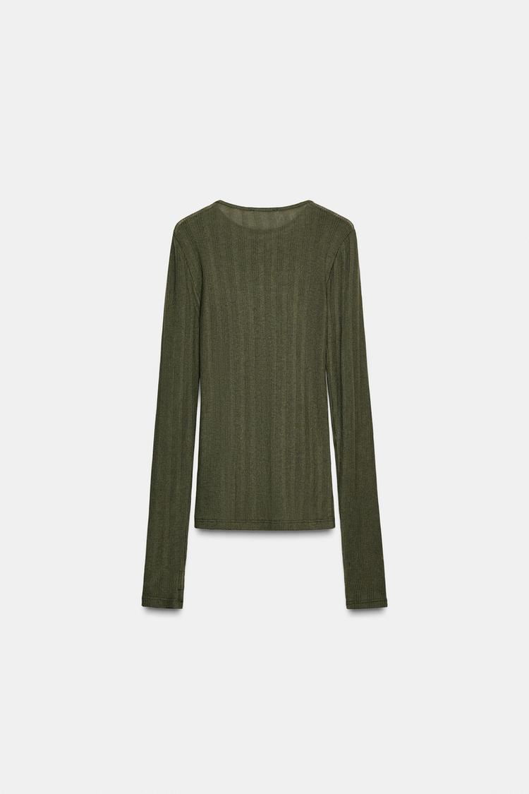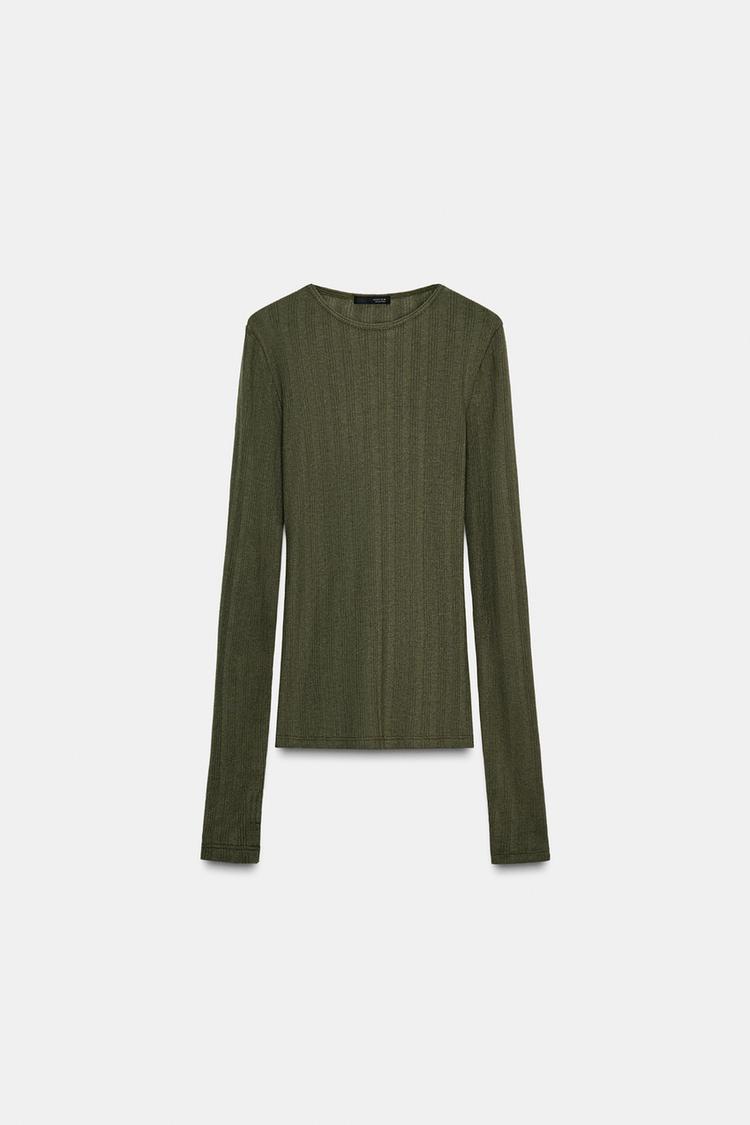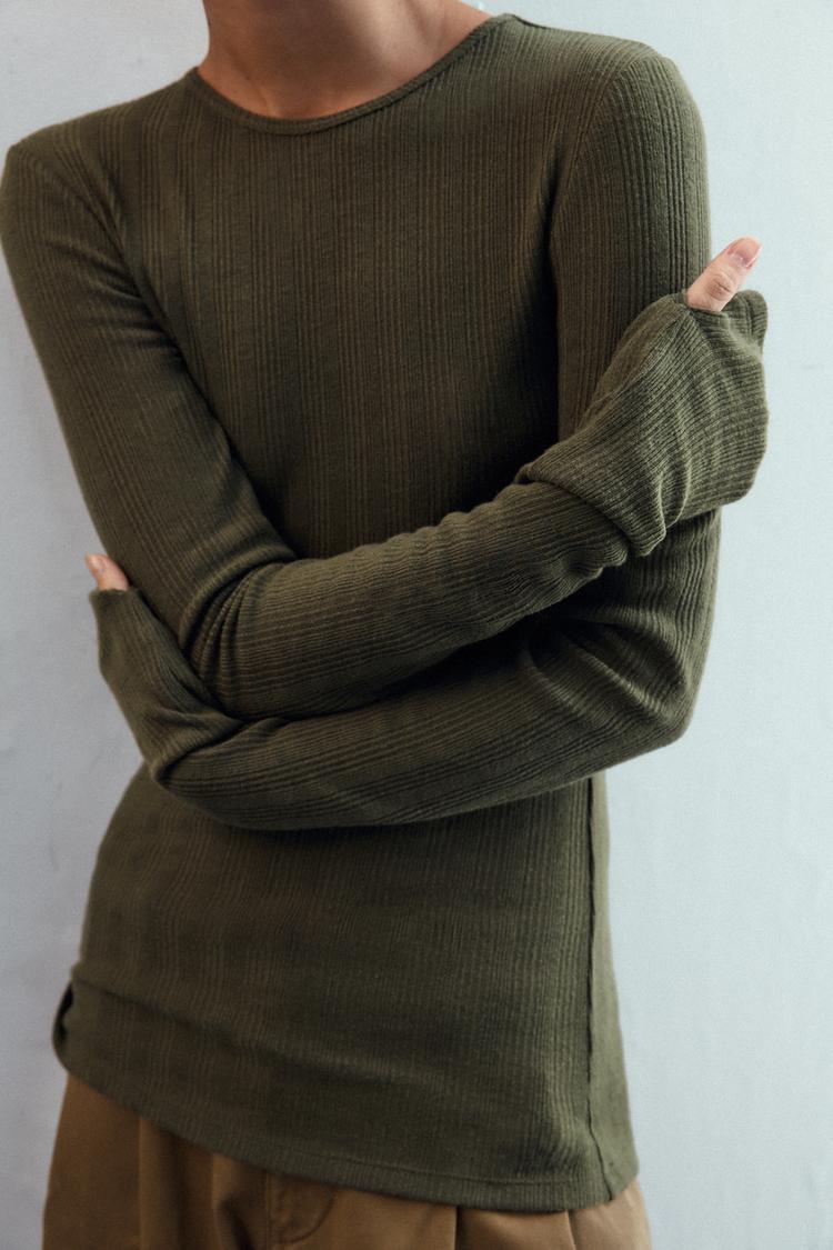 Футболка с круглым вырезом и длинными рукавами. Мягкая ткань в рубчик. Прямой низ.