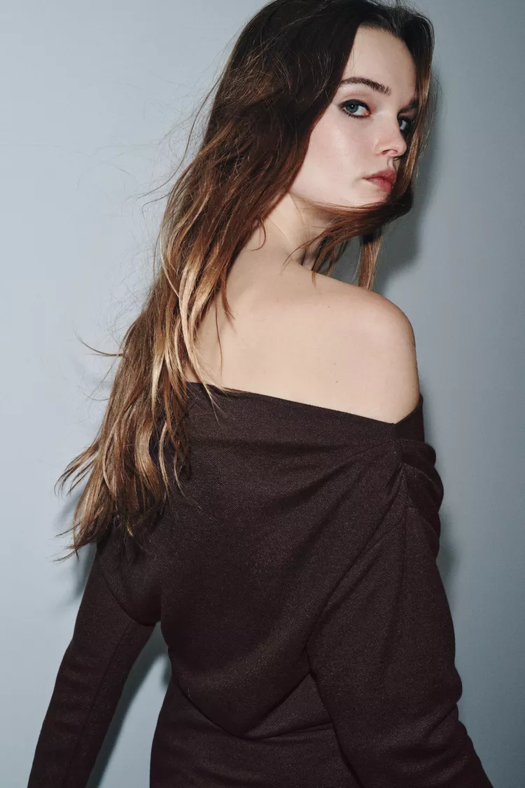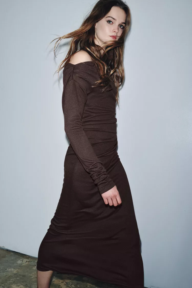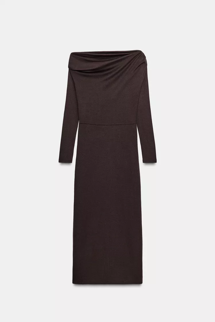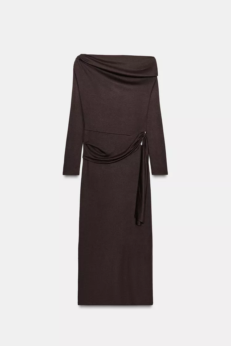 ZARA МЯГКОЕ ПЛАТЬЕ С БРОШЬЮ, КОРИЧНЕВЫЙ