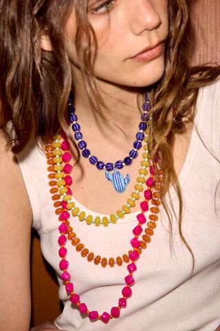 - Три ожерелья из разноцветных бусин разной формы и размера. Застежка-карабин.