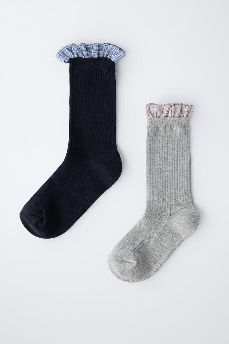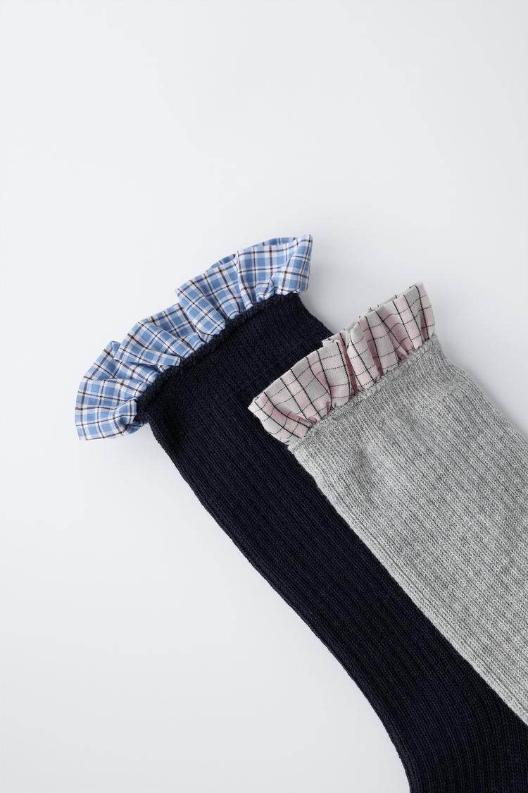 Набор из двух пар длинных носков с воланами из поплина в клетку.