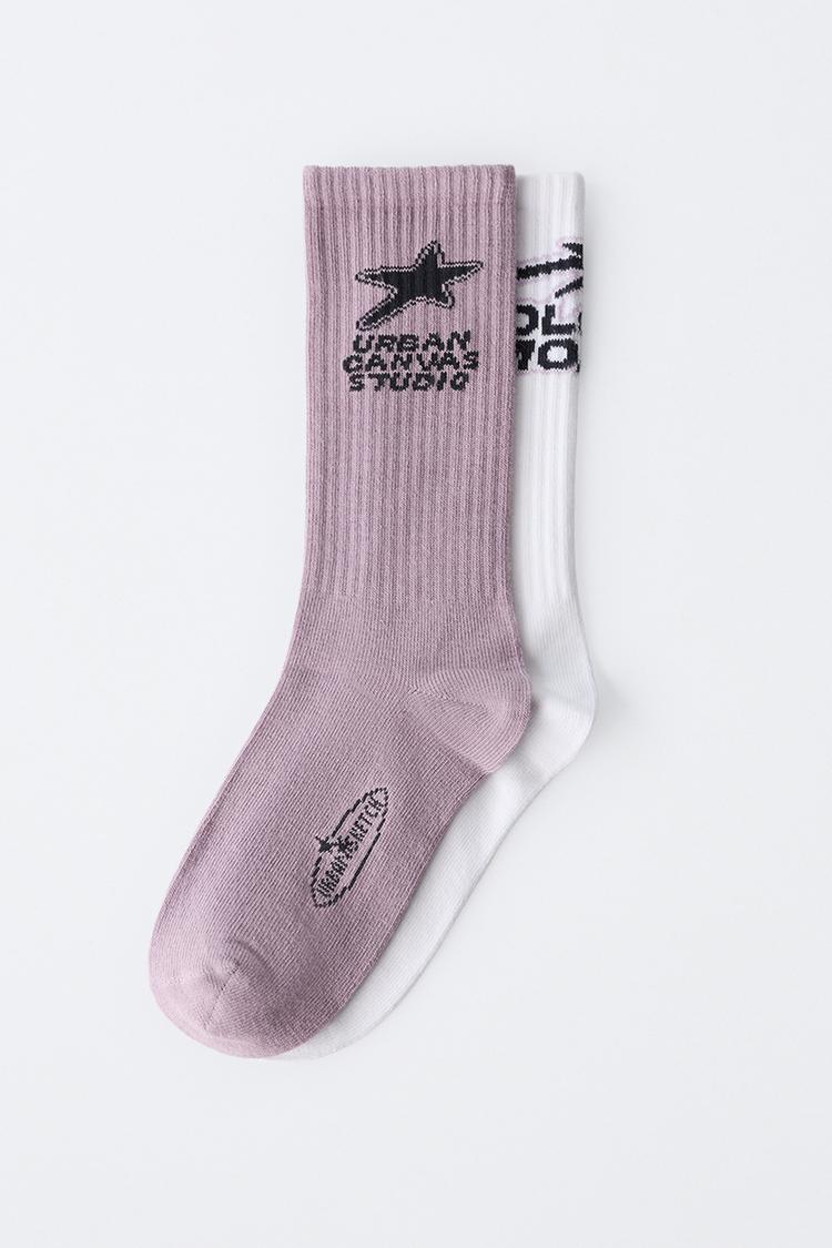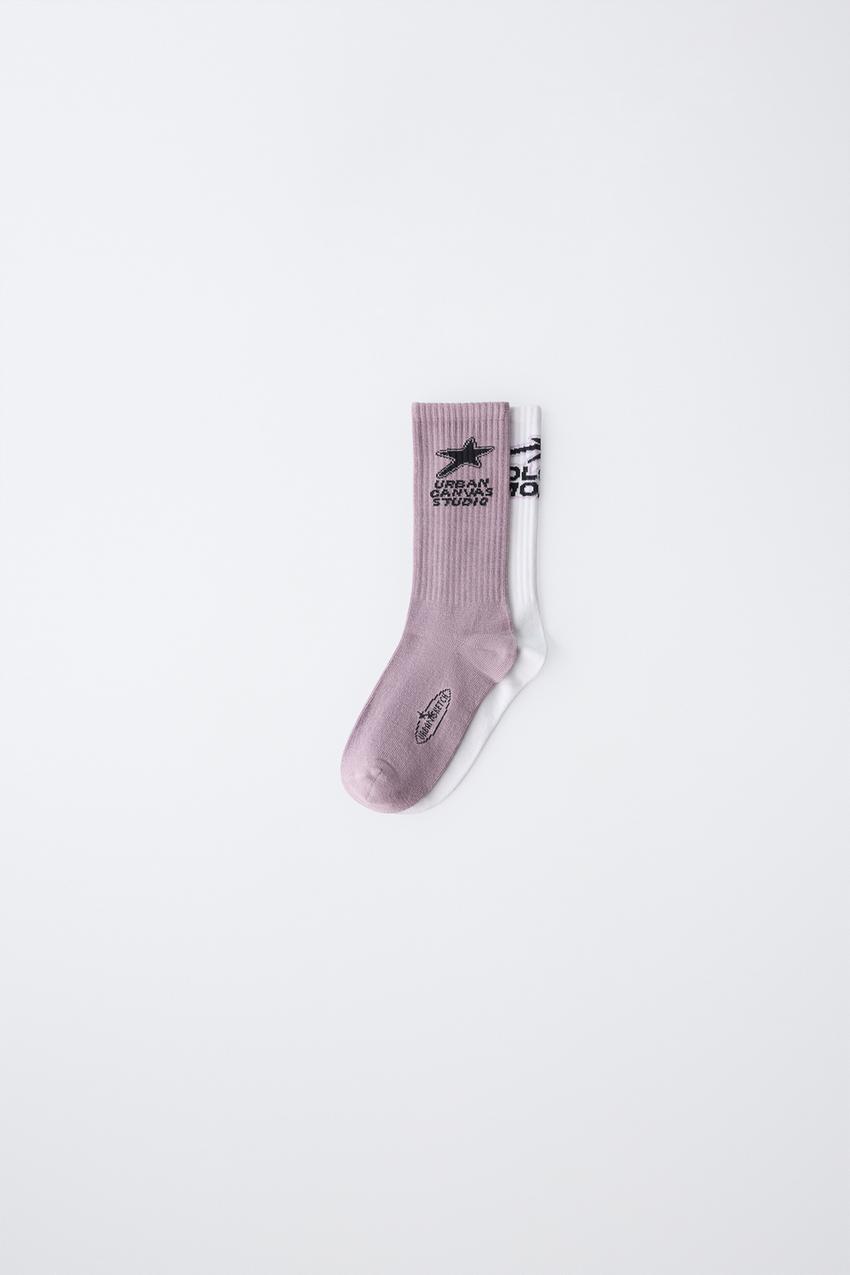 ZARA НАБОР ИЗ ДВУХ ПАР ВЫСОКИХ НОСКОВ С ПРИНТОМ, БЕЛЫЙ