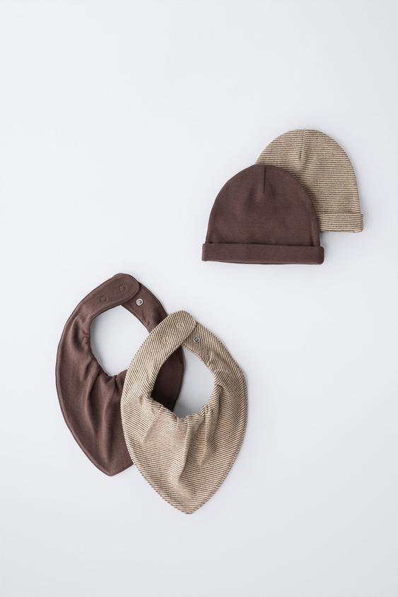 ZARA НАБОР ИЗ ДВУХ ШАПОК И ДВУХ НАГРУДНИКОВ, КОРИЧНЕВЫЙ