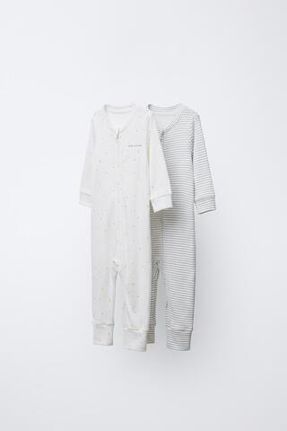 Набор из двух пижам с круглым вырезом и регулируемыми длинными рукавами. Низ регулируется по длине и может превращаться в носки (закрытая пижама). Спереди застежка-молния. Цветочный принт.