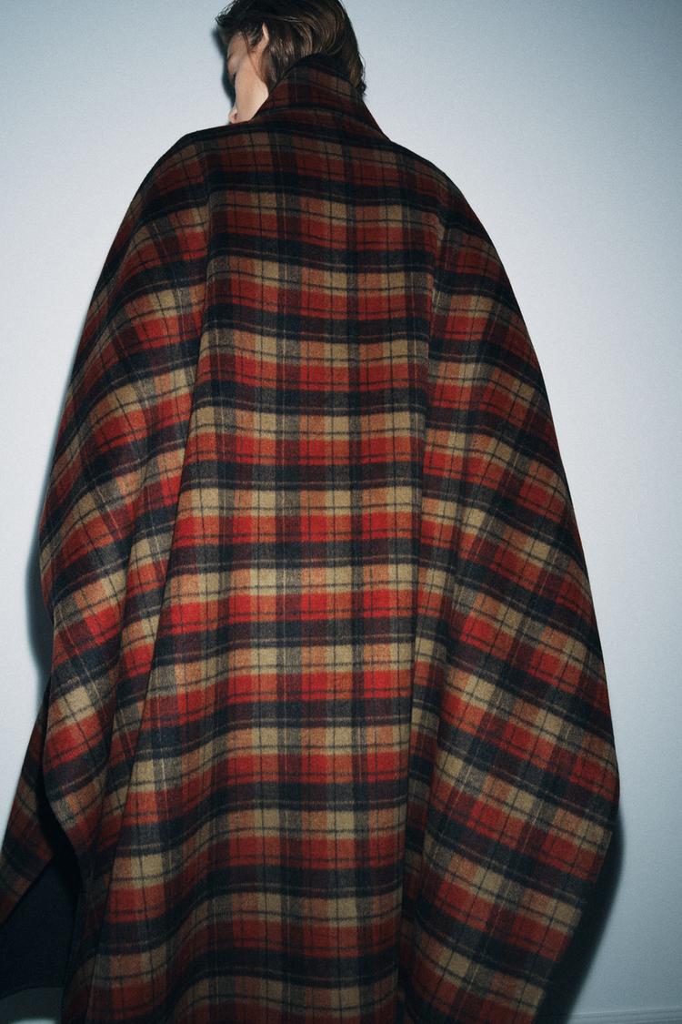 ZARA НАКИДКА В КЛЕТКУ ИЗ ШЕРСТИ, ZW COLLECTION, БОРДОВЫЙ/ЭКРЮ