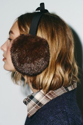 ZARA НАУШНИКИ ИЗ ИСКУССТВЕННОГО МЕХА С БАНТОМ, КОРИЧНЕВЫЙ