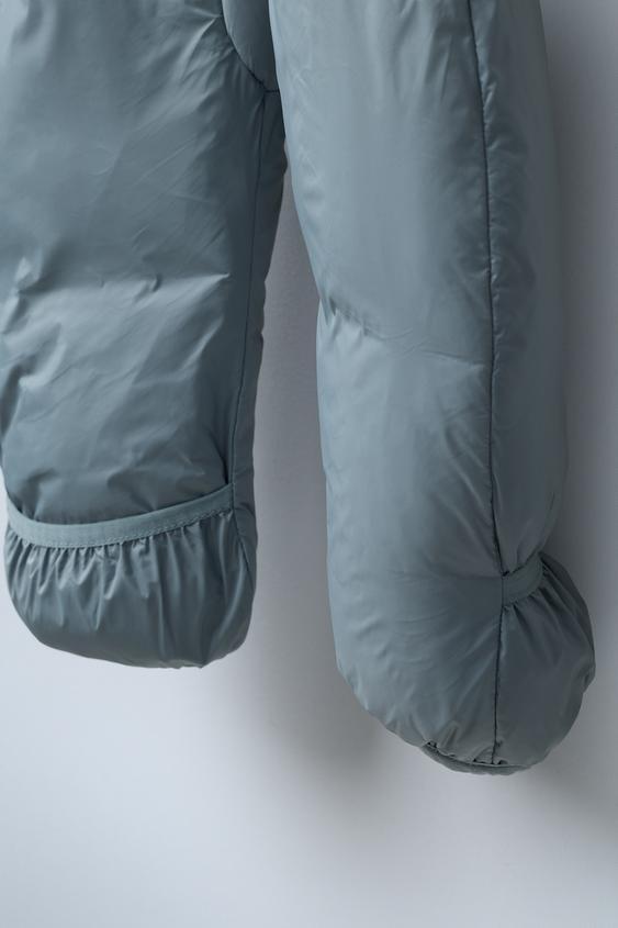 Комбинезон с капюшоном и длинными рукавами на эластичных манжетах. Застежка-запáх на кнопки спереди. Низ с возможностью трансформации в носочки.