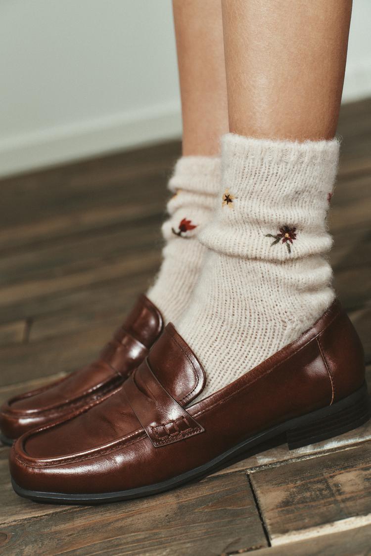 ZARA НОСКИ С ЦВЕТОЧНОЙ ВЫШИВКОЙ, ЭКРЮ