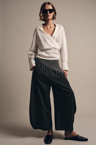 Брюки из пряжи с добавлением лиоцелла и 30% шерсти. Средняя посадка и эластичный пояс. Широкие объемные брючины.