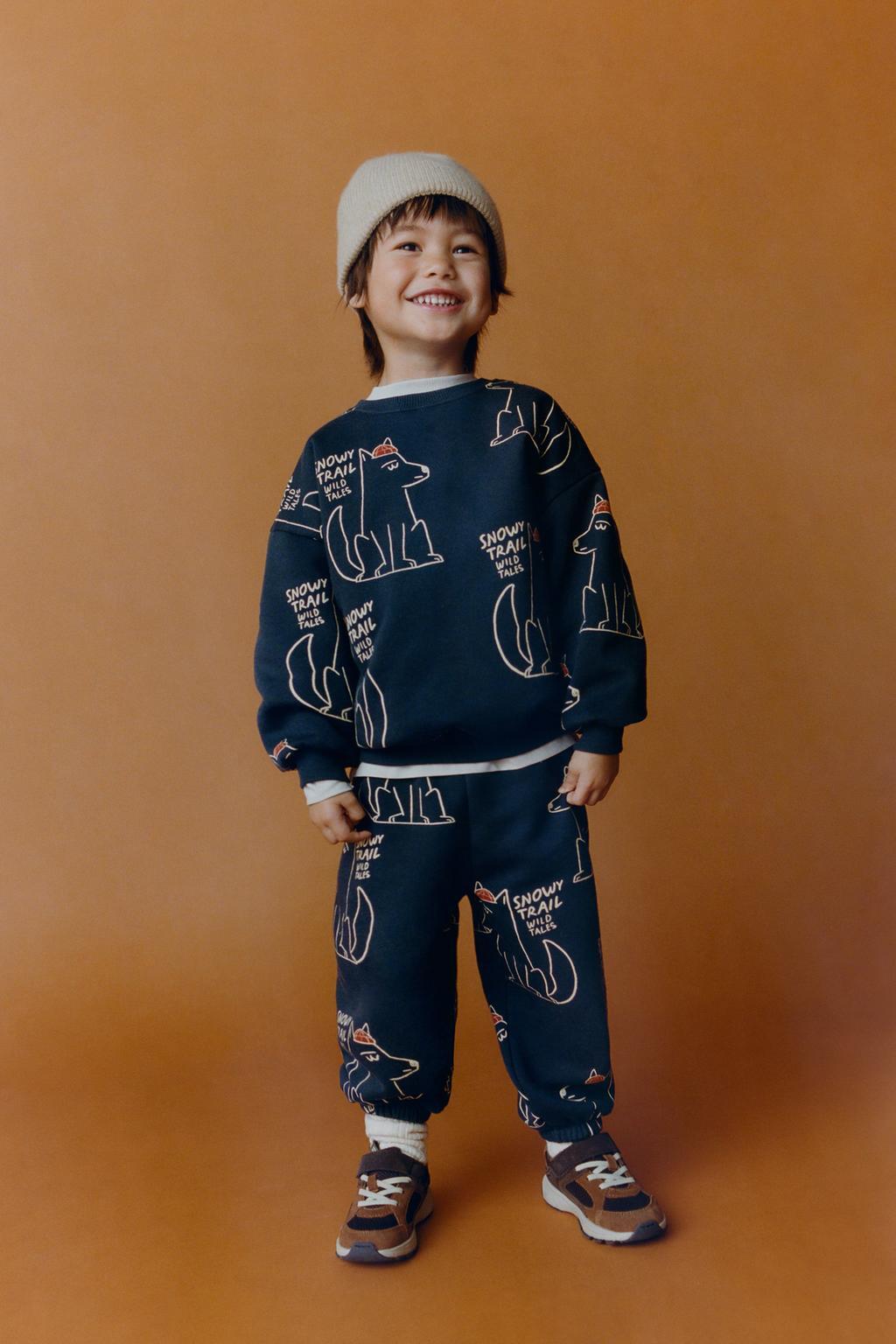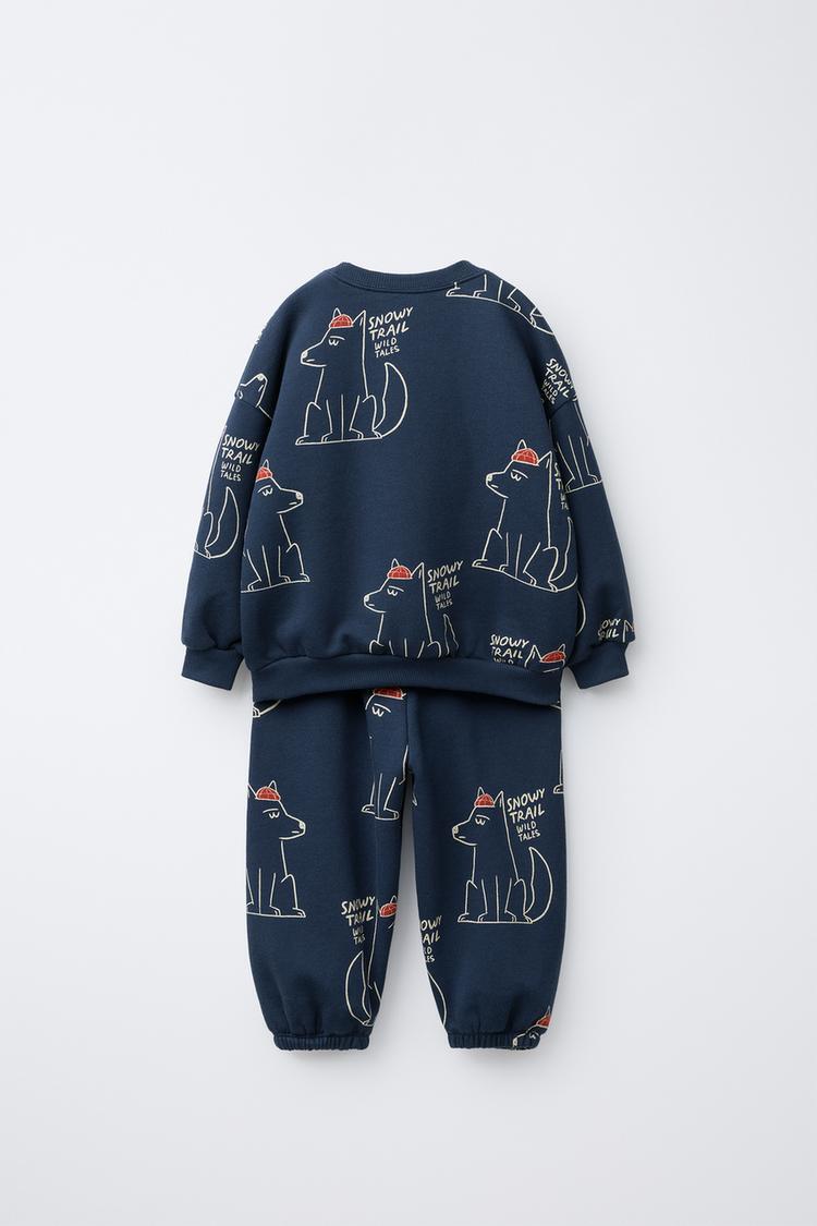 Комплект из двух предметов. Толстовка с круглым вырезом и длинными рукавами. Отделка в рубчик. Брюки-джоггеры с эластичным поясом и манжетами. Внутренняя сторона с начесом, теплая и мягкая. Принт с волками.