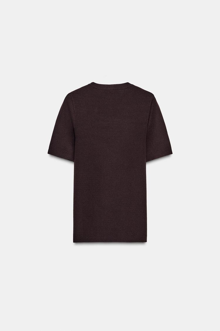 ZARA ОДНОТОННЫЙ ТРИКОТАЖНЫЙ ТОП С КОРОТКИМИ РУКАВАМИ, БАКЛАЖАННЫЙ