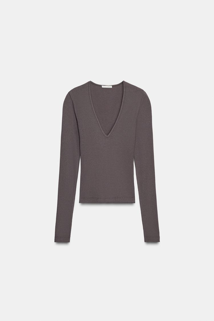 Облегающий топ из ткани в рубчик с V-образным вырезом и длинными рукавами.