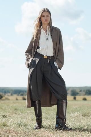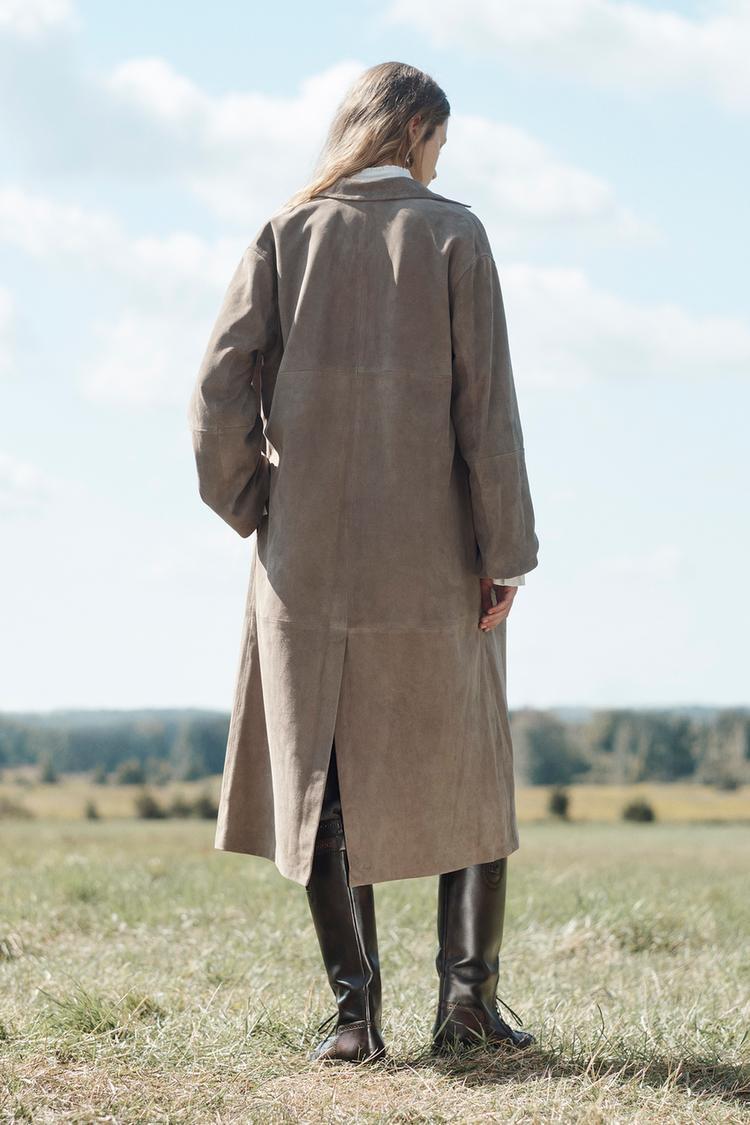 Кашемировая куртка из 100% замши. С отложным воротником, длинными рукавами, четкими деталями на шве, прямой юбкой и контрастной застежкой-пуговицей спереди.