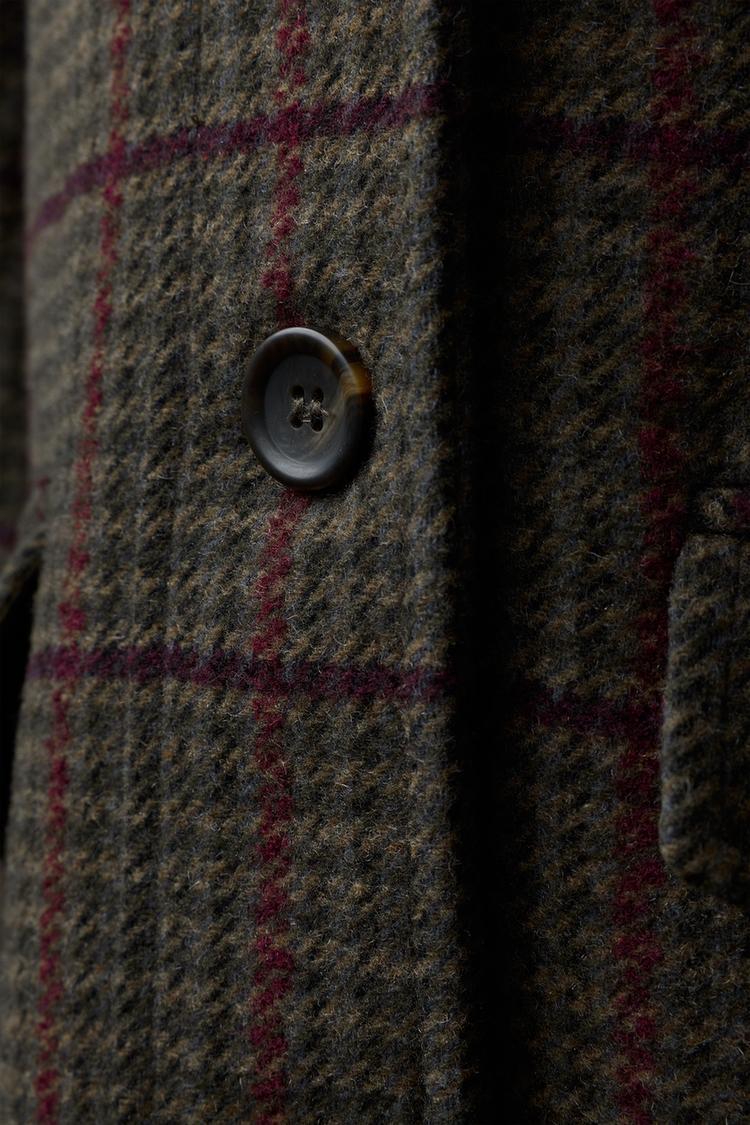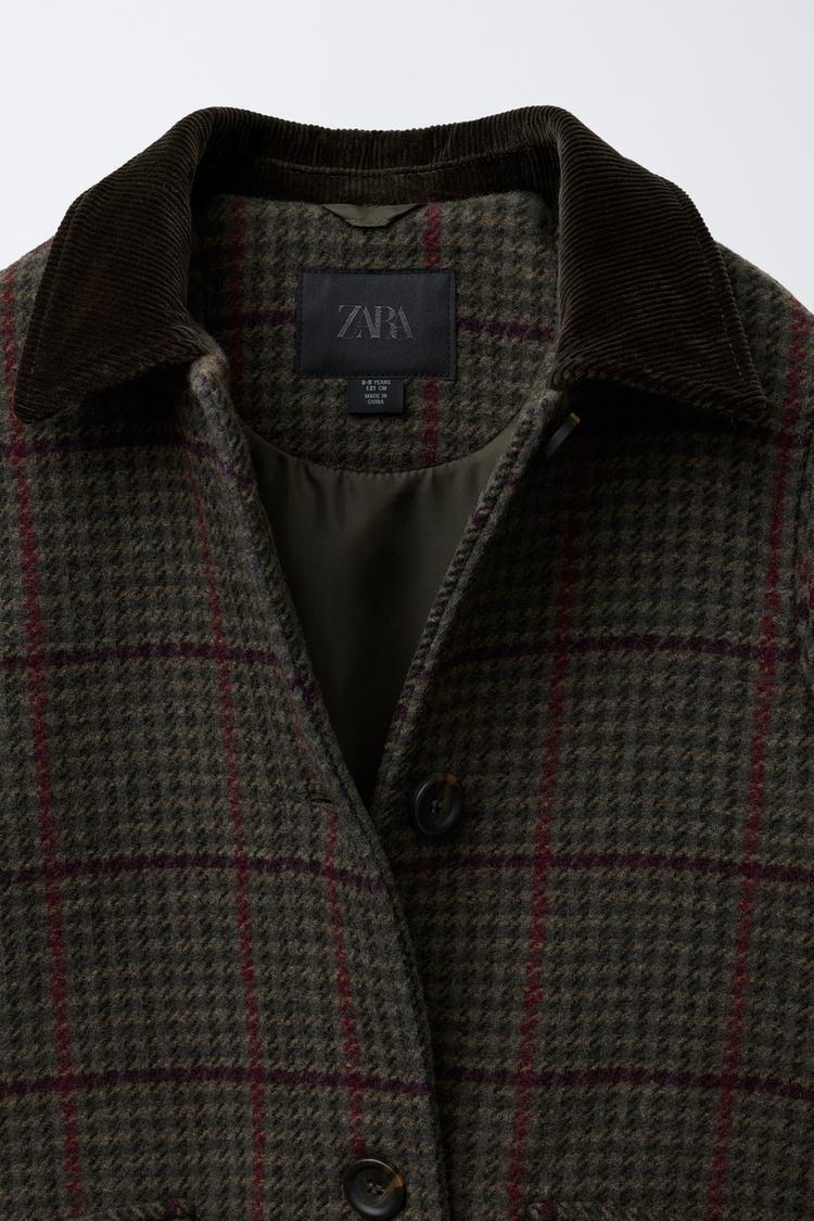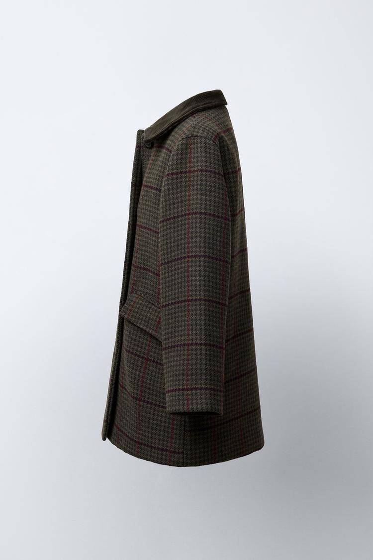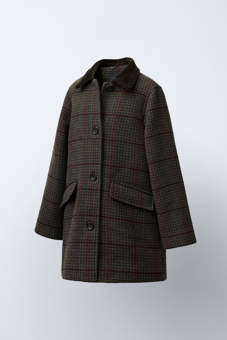 Пальто из смесовой шерсти с воротником рубашечного типа из вельвета и длинными рукавами. Застегивается на пуговицы. Передние карманы с клапанами. Узор в клетку.