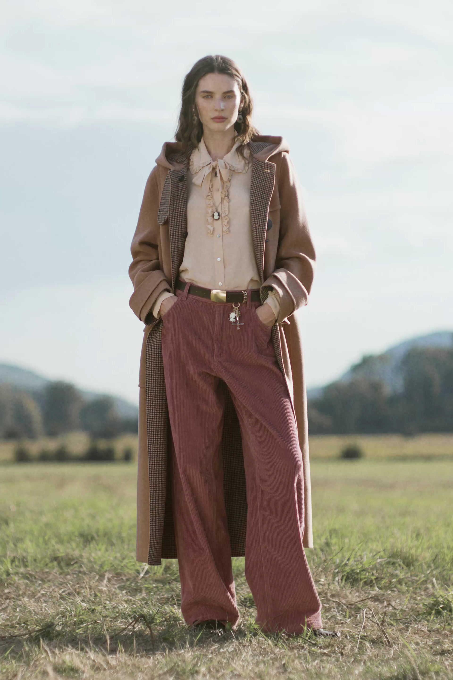 Кашемировое пальто с капюшоном. Длинные рукава с пуговицами и пуговицами. Передний карман с накладным карманом на клапане. Юбка с разрезом сзади. Передняя часть украшена пуговицами.
