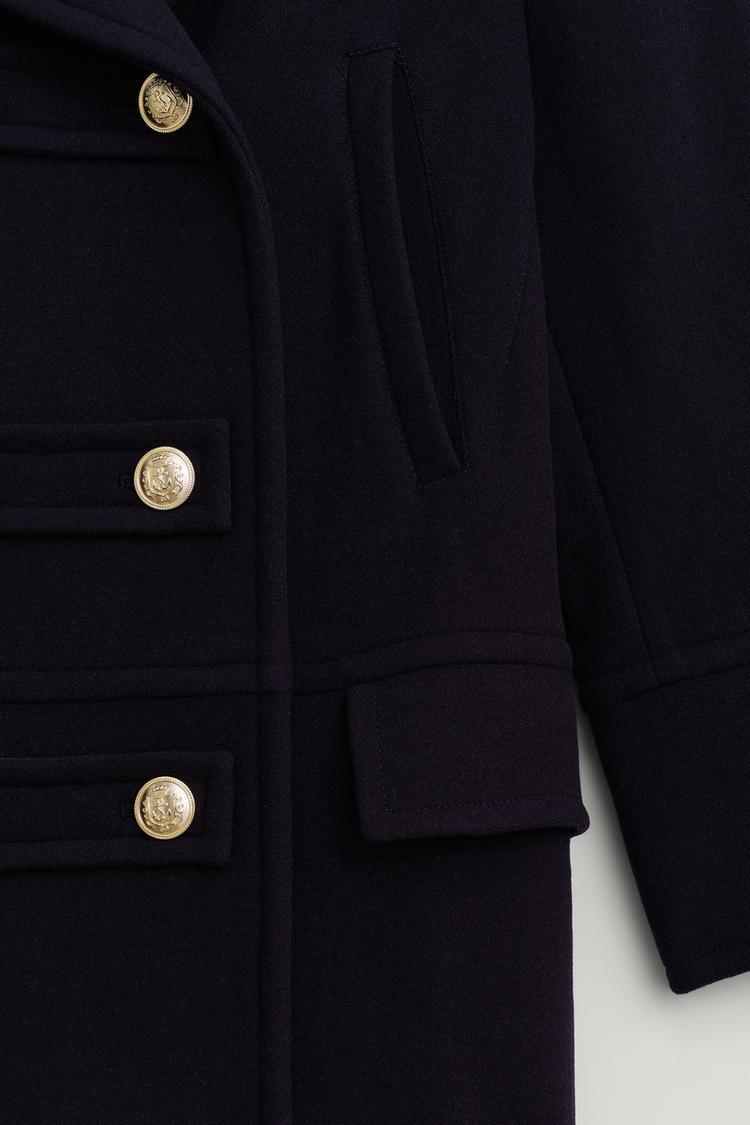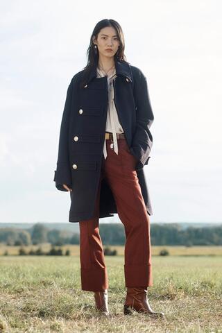 Пальто с длинными рукавами. Передние карманы с клапанами. Прямой крой. Двубортный крой с металлическими пуговицами с тиснением спереди.