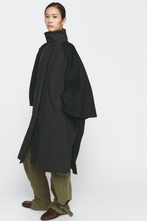Накидка из смесовой шерсти. Высокий воротник и длинные рукава типа накидки. Передние карманы. Асимметричный низ с боковыми разрезами. Застежка-молния спереди и пуговицы, скрытые планкой.