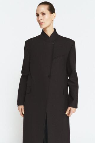 Пальто-сюртук из смесовой шерсти. Воротник-стойка, длинные рукава с разрезами и пуговицами. Передние карманы с клапанами, прорезной нагрудный карман. Застежка на пуговицы спереди.