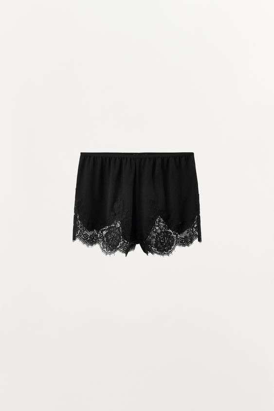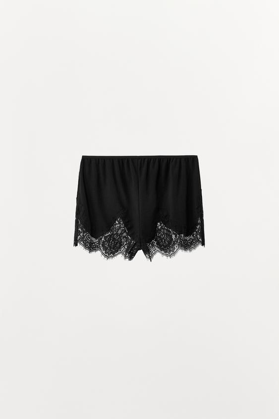 ZARA ПЕРФОРИРОВАННЫЕ ШОРТЫ С КРУЖЕВОМ, ЧЕРНЫЙ