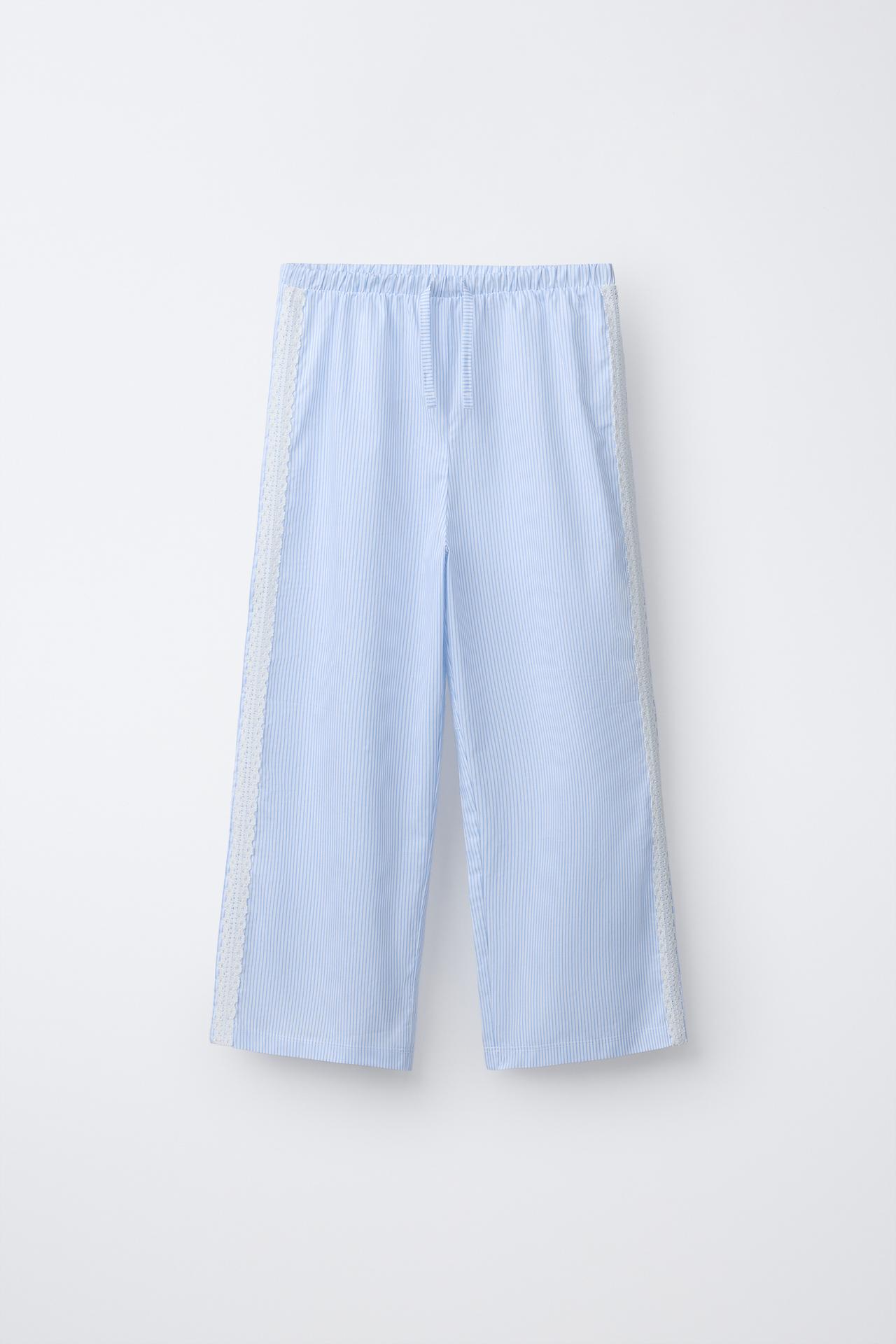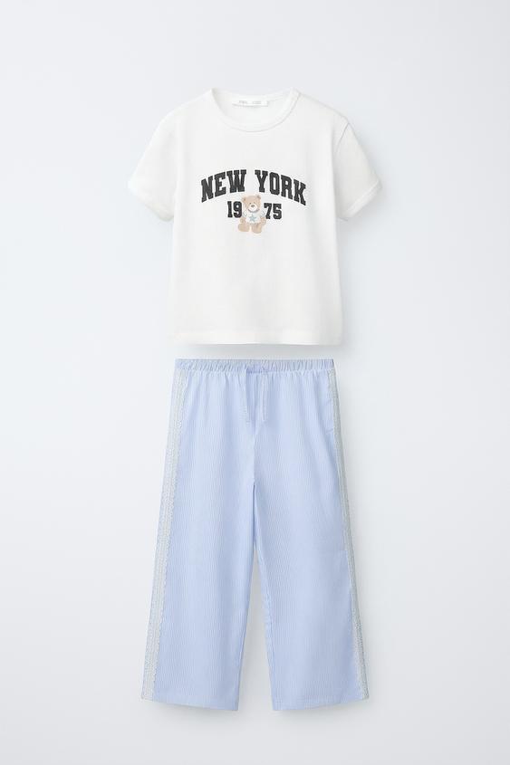 Пижама из двух предметов. Футболка с круглым вырезом и короткими рукавами. Принт спереди. Брюки с эластичным поясом, декоративным шнурком спереди, принтом в полоску и кружевными вставками по бокам.