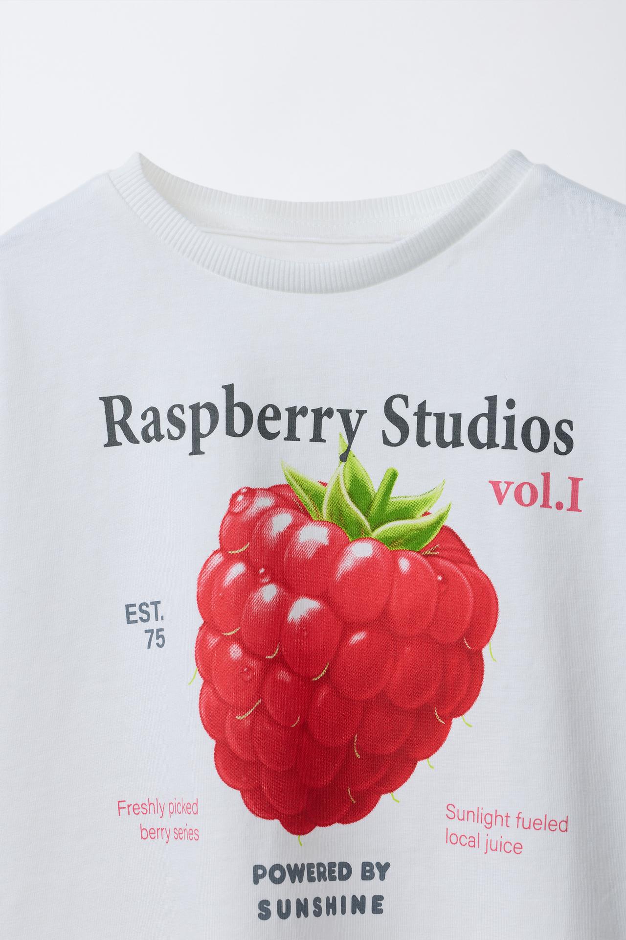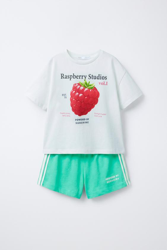 Пижама из двух предметов. Футболка с круглым вырезом и короткими рукавами. Принт «Малина» спереди. Шорты-бермуды с эластичным поясом. Контрастные полоски по бокам и текстовый принт.