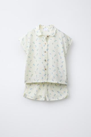 Пижамный комплект из двух частей. Рубашка с отложным воротником и коротким рукавом. Застежка спереди на пуговицы. Шорты-бермуды с эластичным поясом. Цветочный принт.