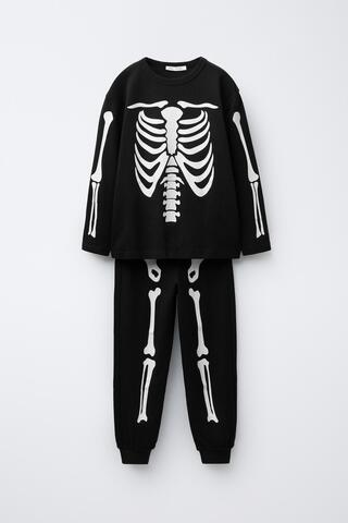 Пижама из двух частей. Футболка с круглым вырезом и длинными рукавами. Брюки с эластичным поясом и манжетами. Специальный принт, светящийся в темноте.