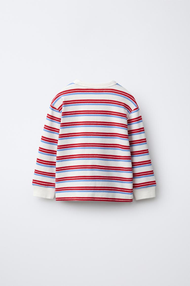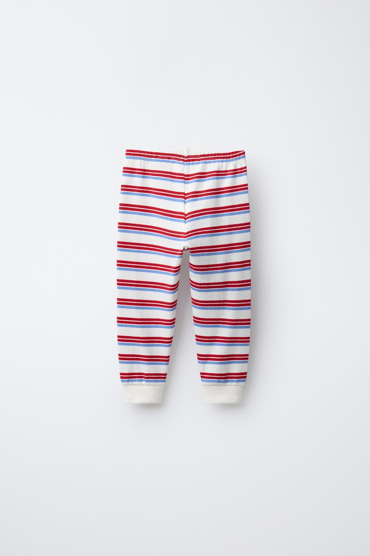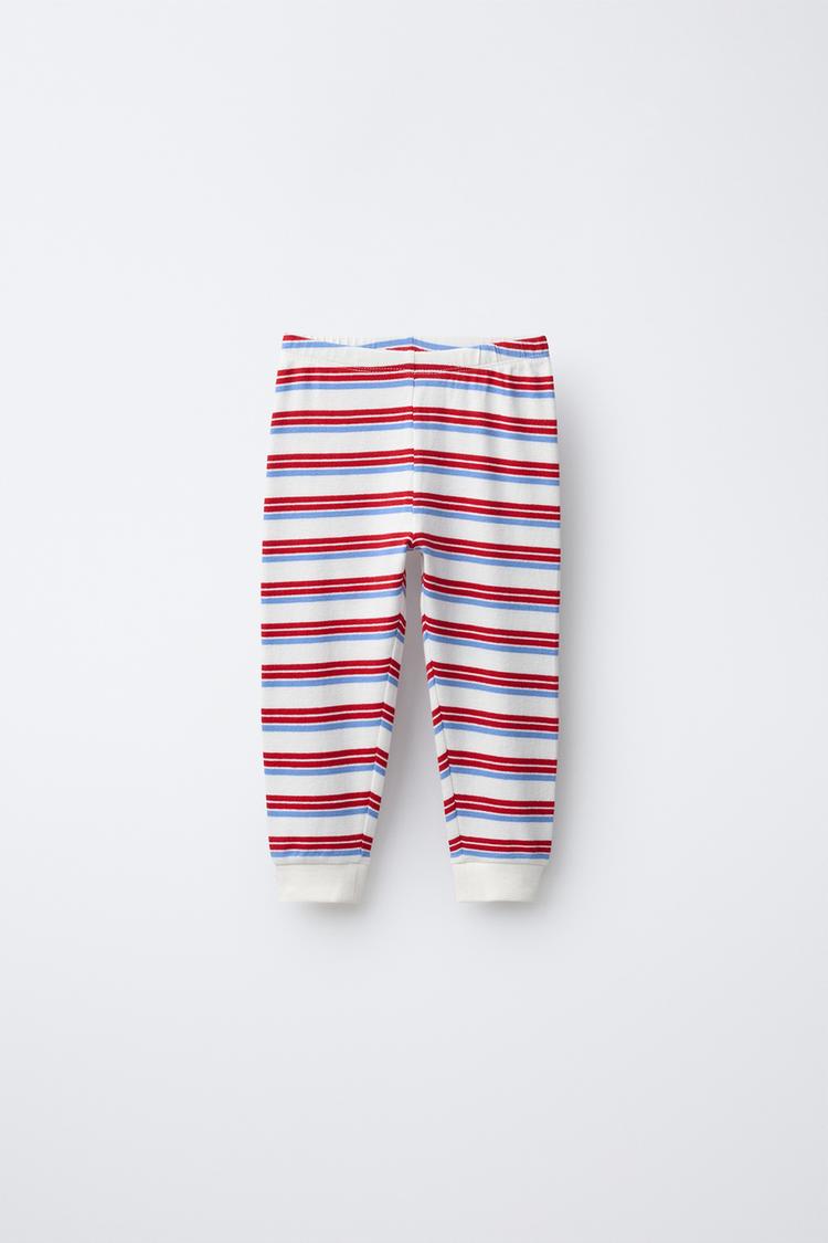 Пижама из двух предметов. Футболка с круглым вырезом и длинными рукавами с манжетами. Этикетка внизу. Брюки с эластичным поясом и манжетами. Принт в полоску.