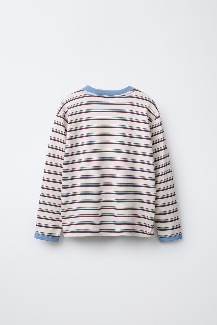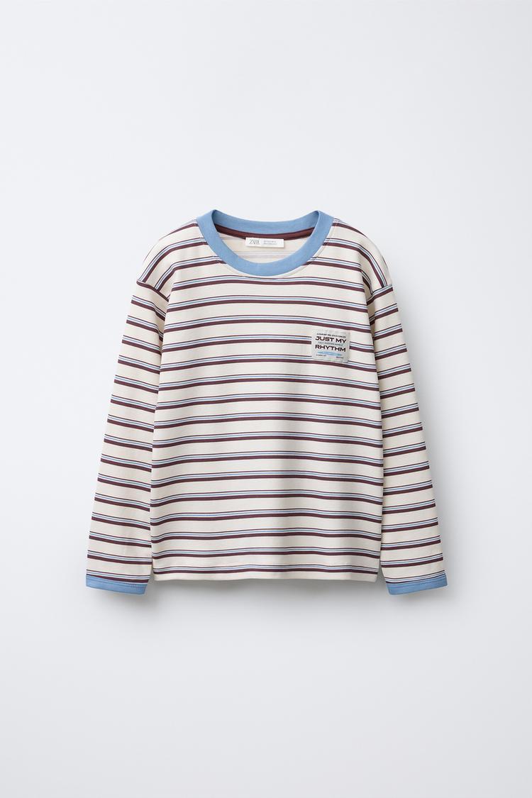 Пижама из двух частей. Футболка с круглым вырезом и длинными рукавами. Аппликация в виде этикетки на груди и полосатый принт. Однотонные брюки с эластичным поясом и передними карманами.