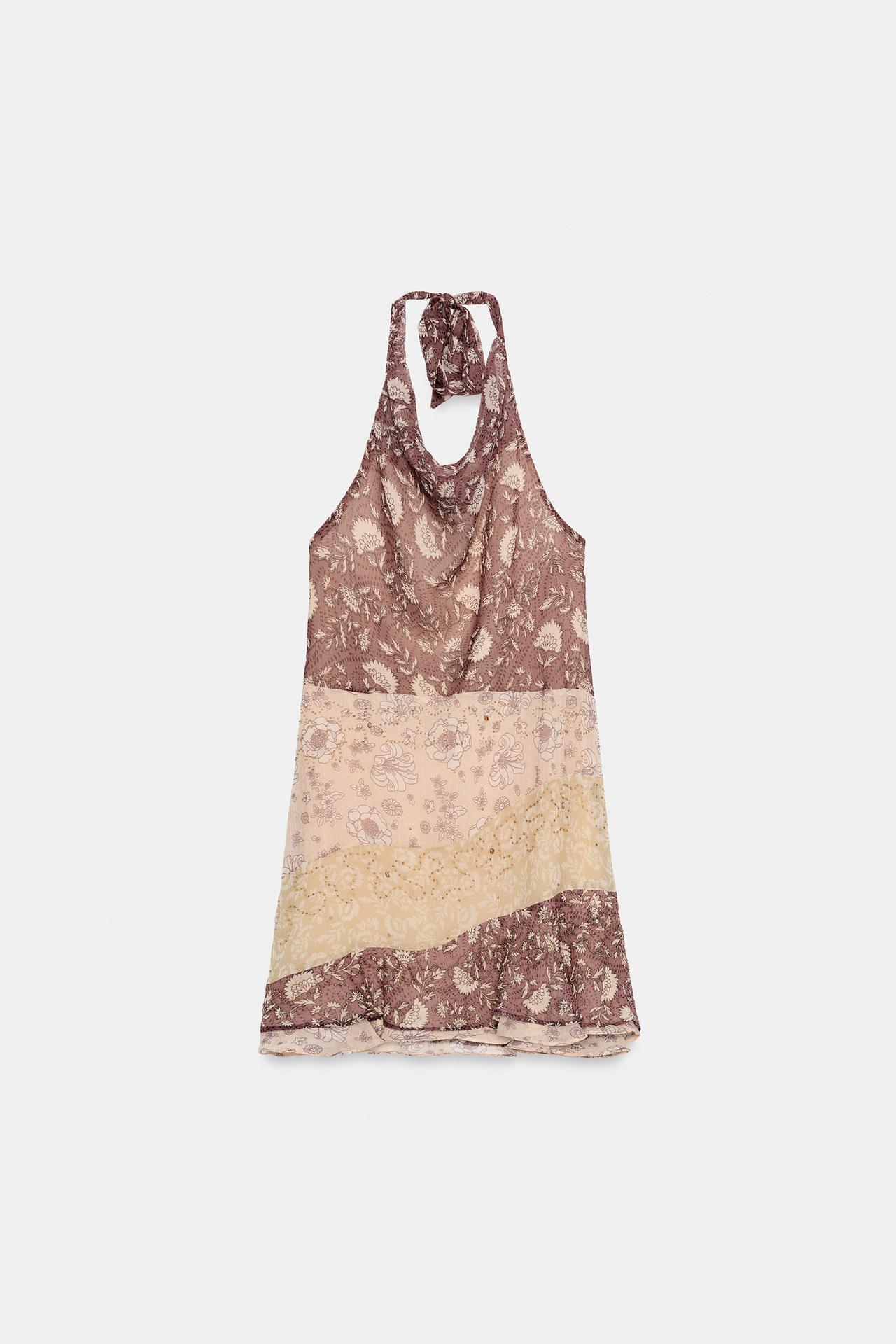ZARA ПЛАТЬЕ ХАЛТЕР С ПРИНТОМ И БУСИНАМИ, РАЗНОЦВЕТНЫЙ