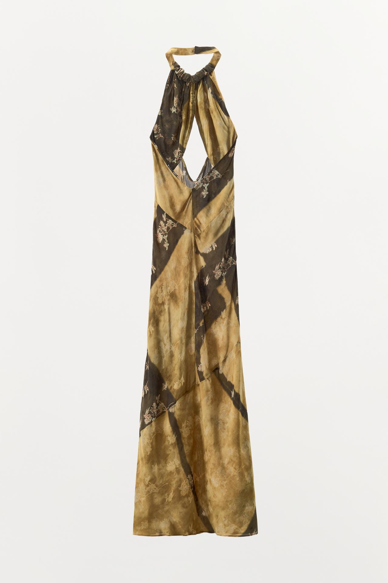 Длинное платье с принтом, основная ткань — 100% вискоза. Регулируемый воротник-халтер на пуговицах и открытые плечи. Разрез на груди.