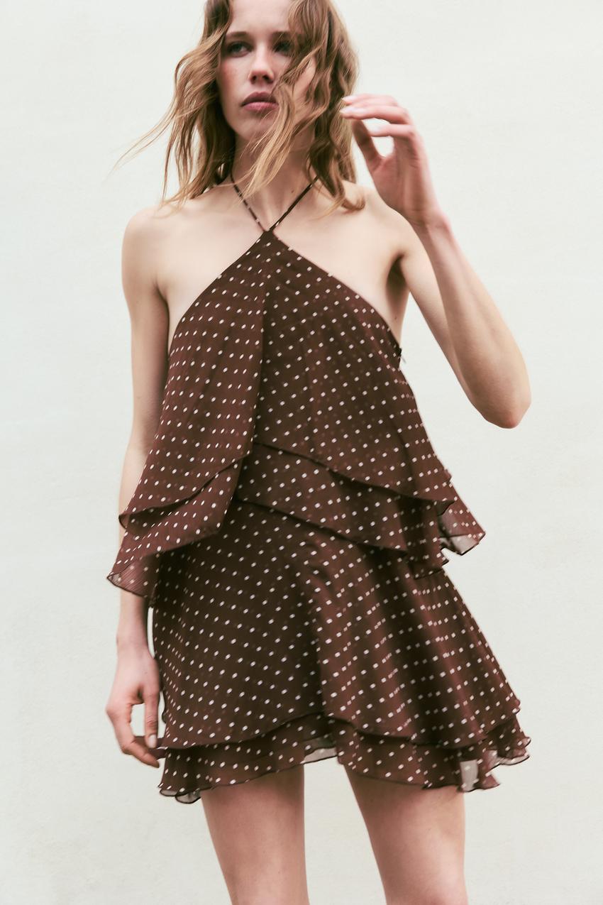 ZARA ПЛАТЬЕ ХАЛТЕР С ВОЛАНАМИ В ГОРОШЕК, КОРИЧНЕВЫЙ/БЕЛЫЙ