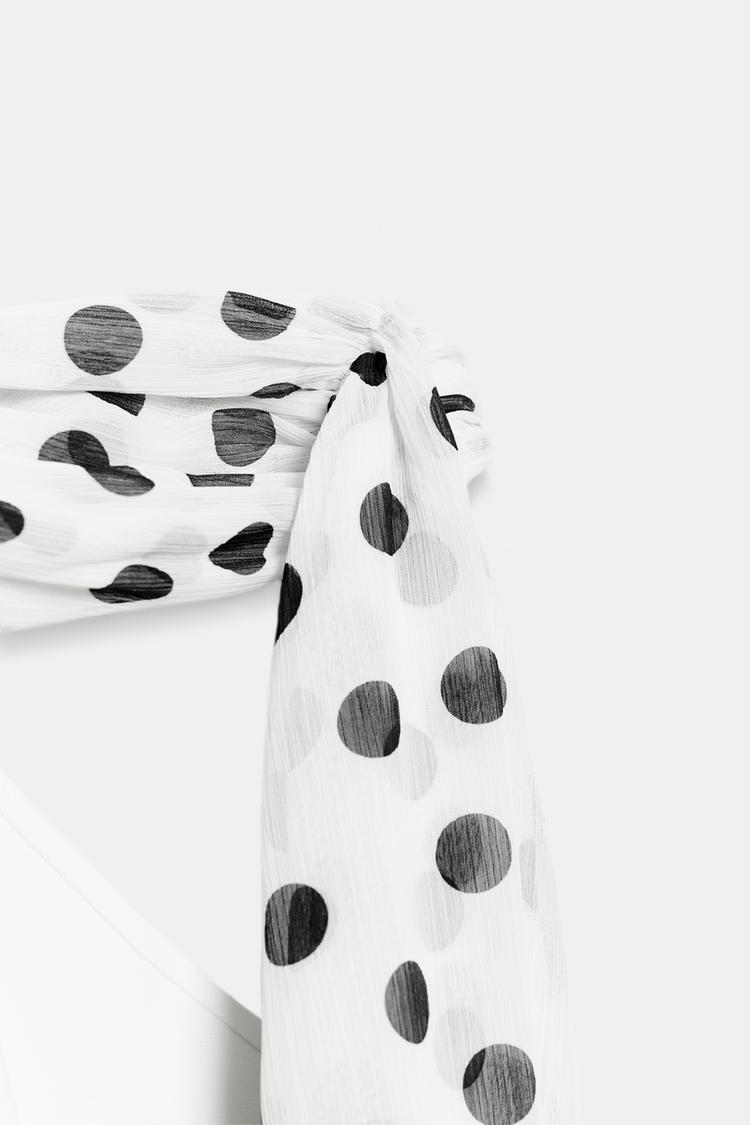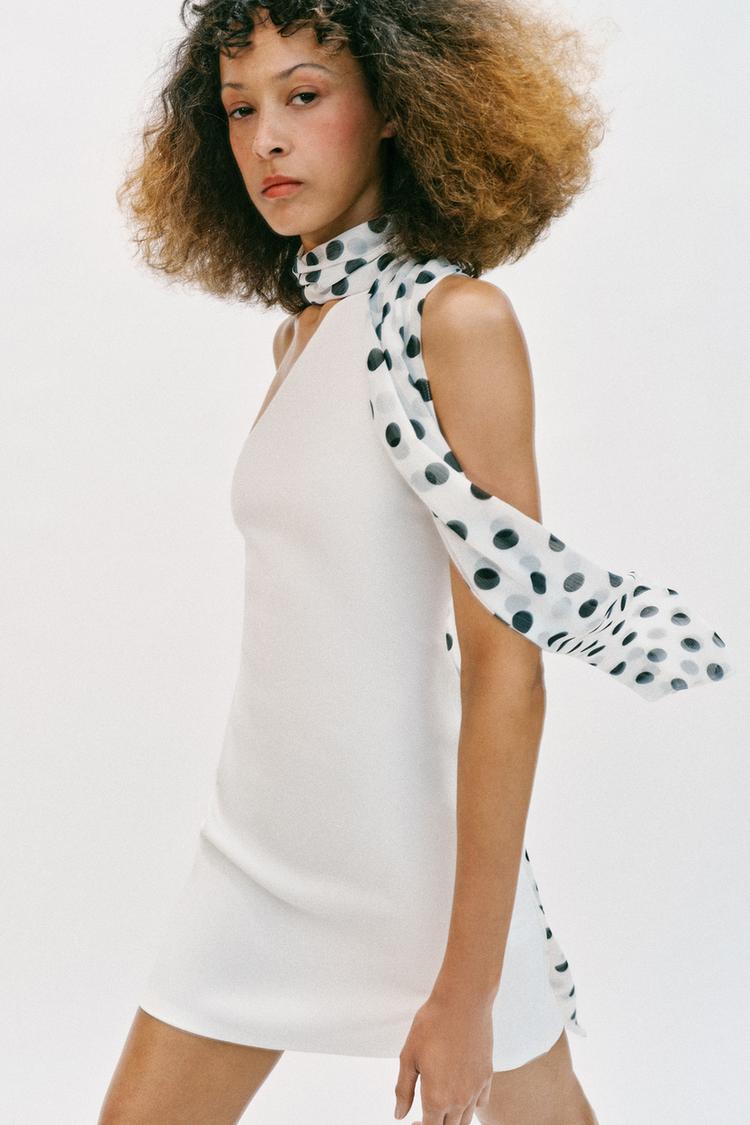Короткое платье с горловиной халтер и открытыми плечами. Декоративный платок в тон с принтом в горошек. Прямой подол.
