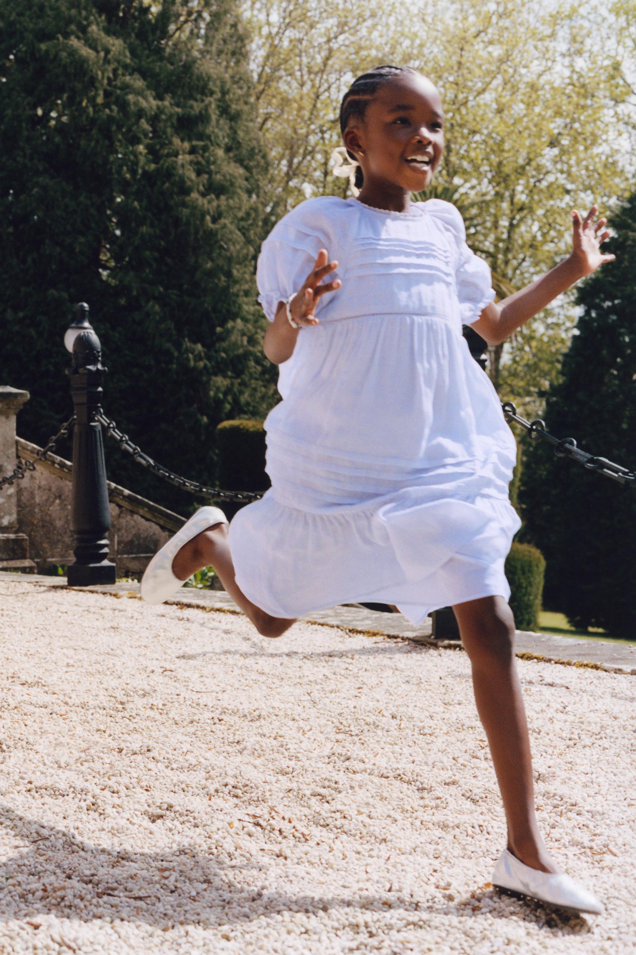 Платье с круглым вырезом и короткими рукавами на резинке. Каплевидный вырез с пуговицей сзади. Сборки и кружевная отделка. Основная ткань: 100% рами.