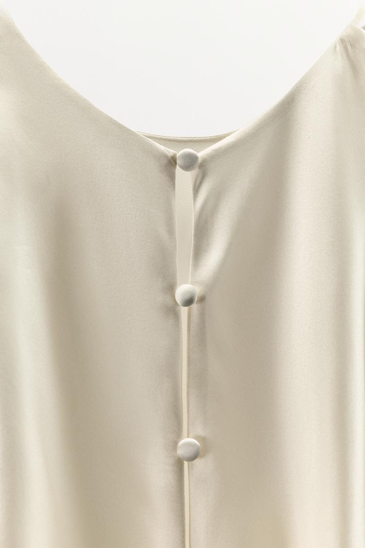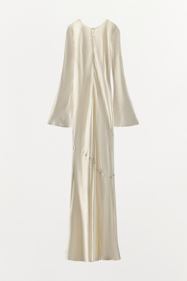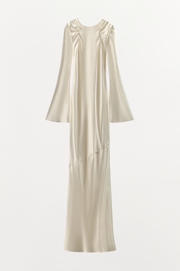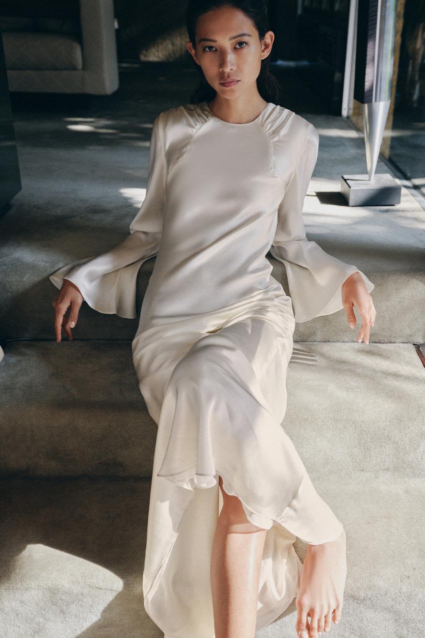 ZARA ПЛАТЬЕ ИЗ 100% ШЕЛКА СО СБОРКАМИ, ЖЕЛТОВАТО-БЕЛЫЙ