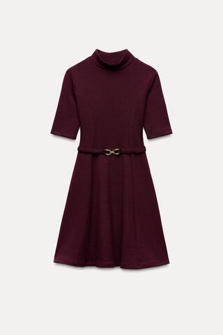 Короткое платье с высоким воротником и короткими рукавами. Ремень из той же ткани.