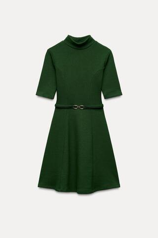 Короткое платье с высоким воротником и короткими рукавами. Ремень из той же ткани.