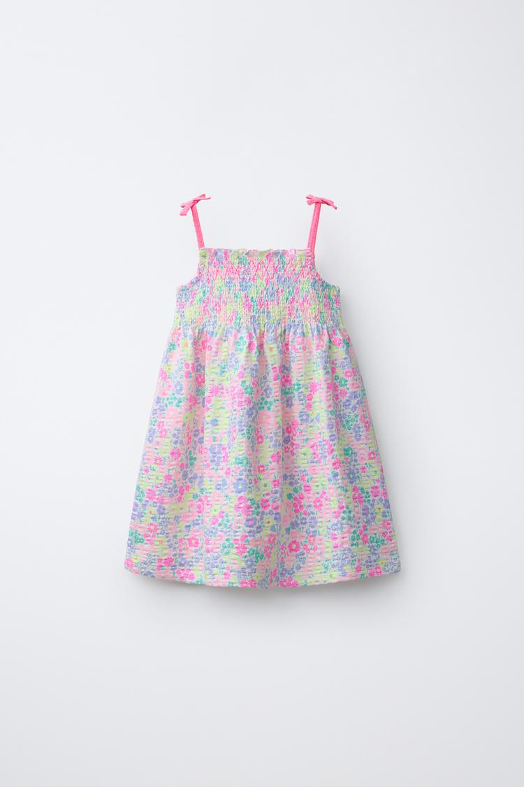 Платье с прямым вырезом и бретелями с бантами. Детали в виде сот на кокетке. Цветочный принт.