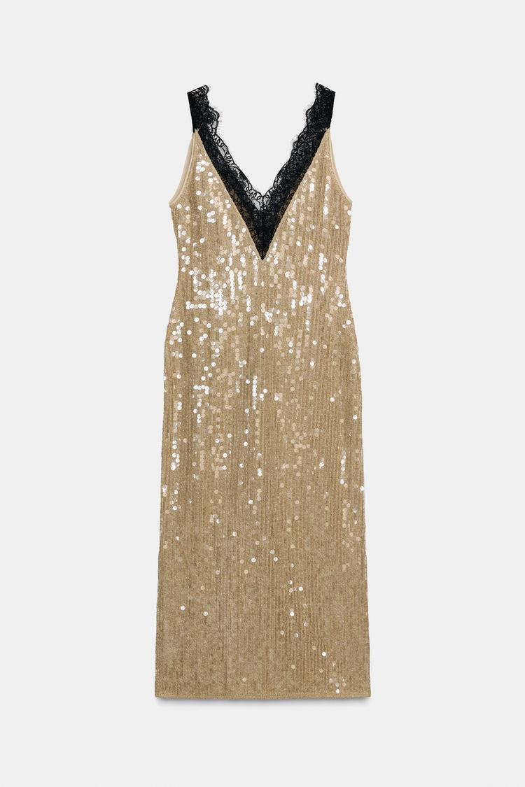 ZARA ПЛАТЬЕ ИЗ КОЛЛЕКЦИИ ZW С ПАЙЕТКАМИ И КРУЖЕВОМ, ЗОЛОТИСТЫЙ