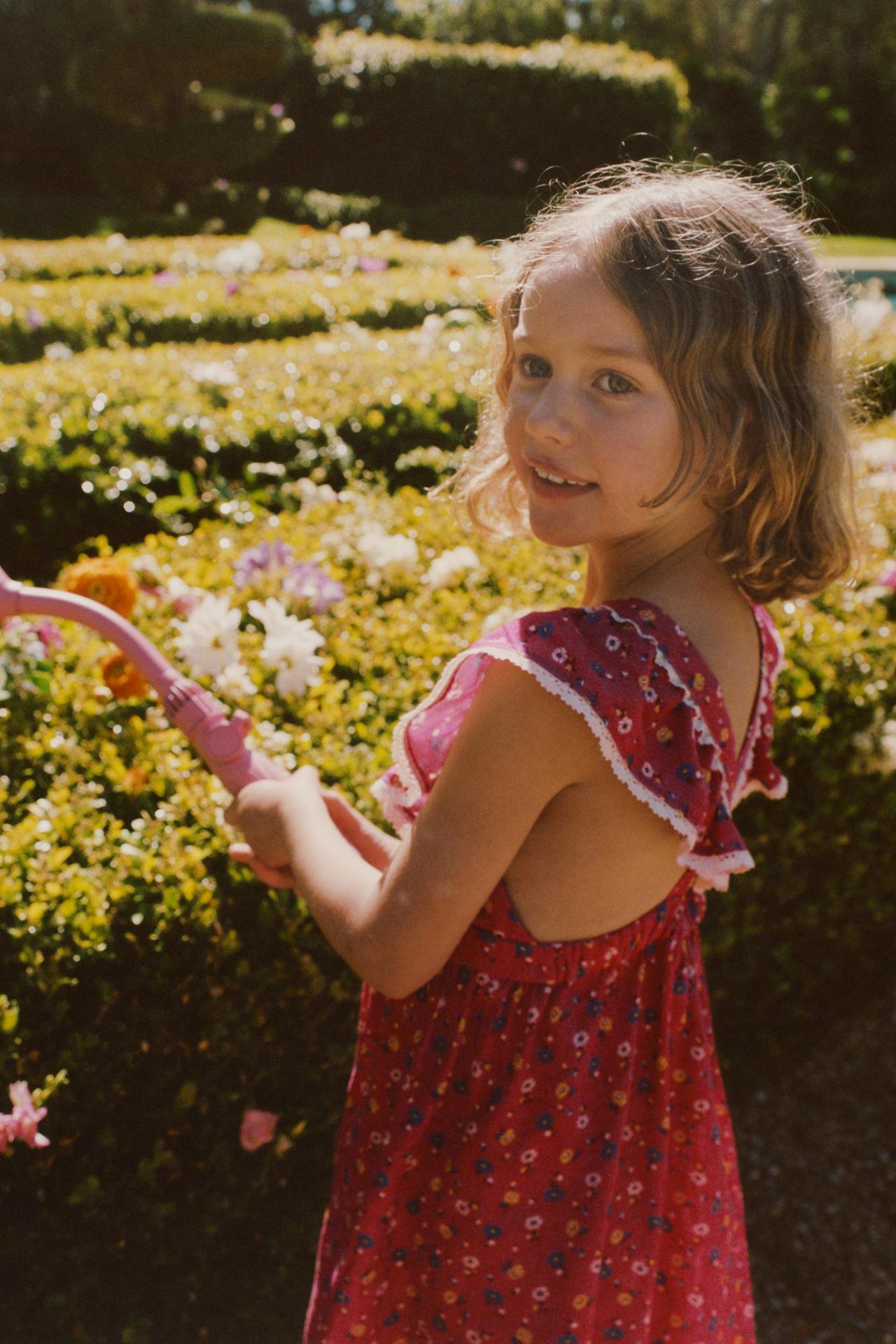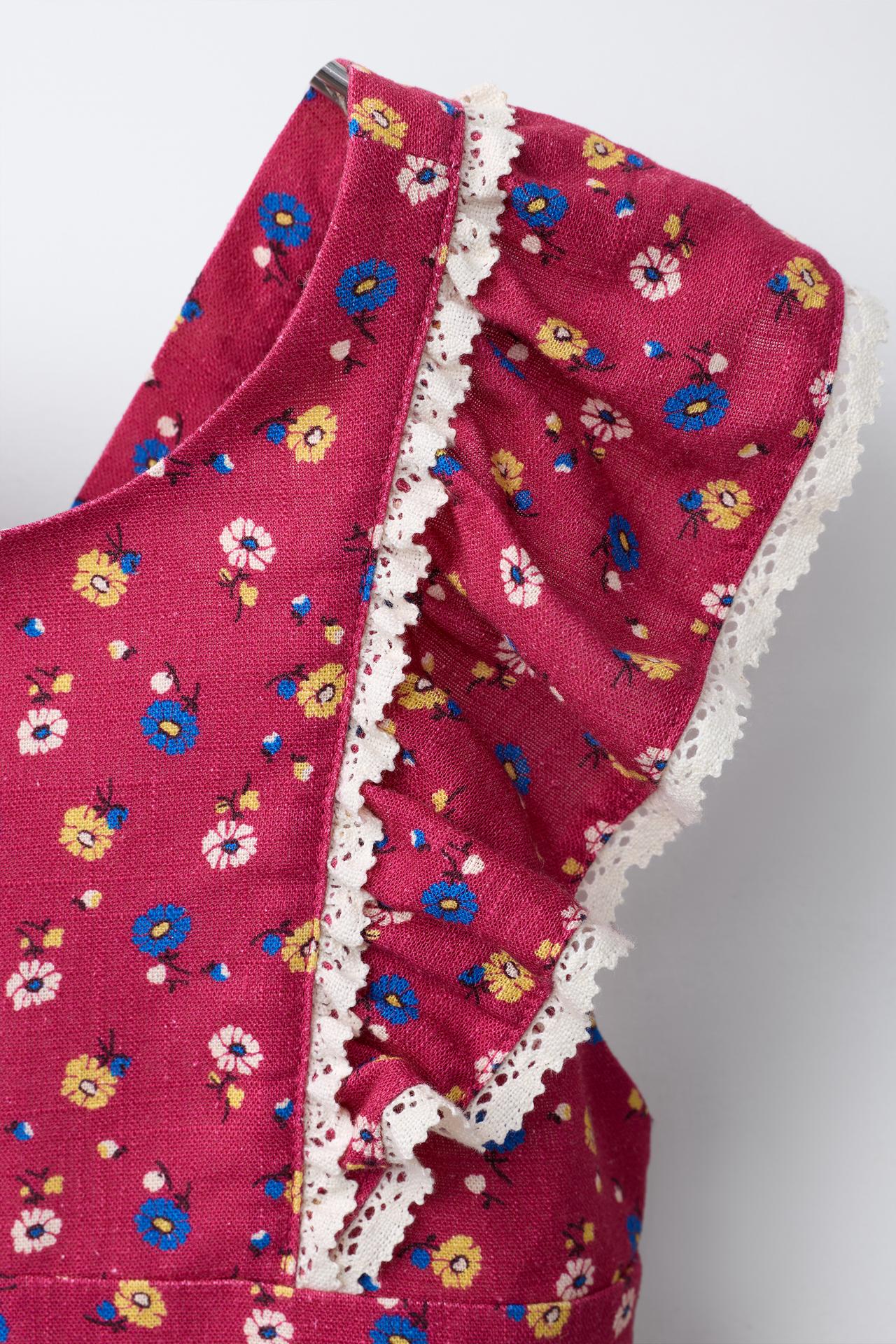 Платье с круглым вырезом и перекрестными бретелями на спине с воланами и кружевом. Цветочный принт. Основная ткань содержит 18% льна.