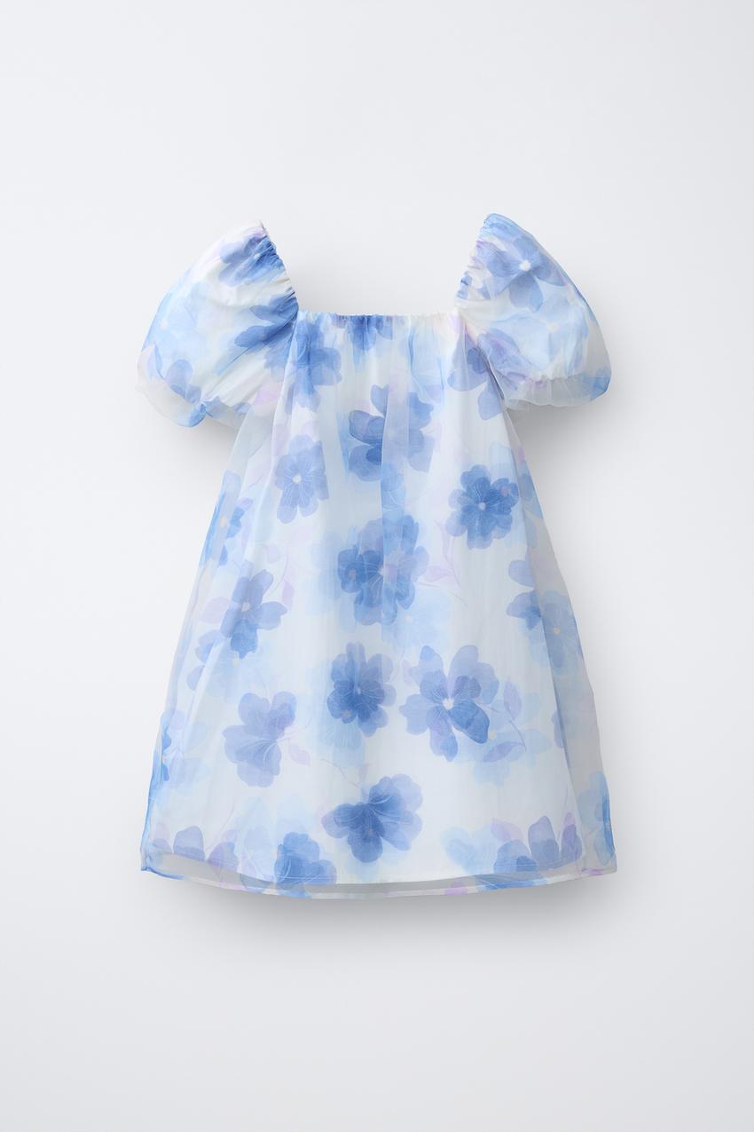 ZARA ПЛАТЬЕ ИЗ ОРГАНЗЫ С ЦВЕТОЧНЫМ ПРИНТОМ, ЭКРЮ/СИНИЙ