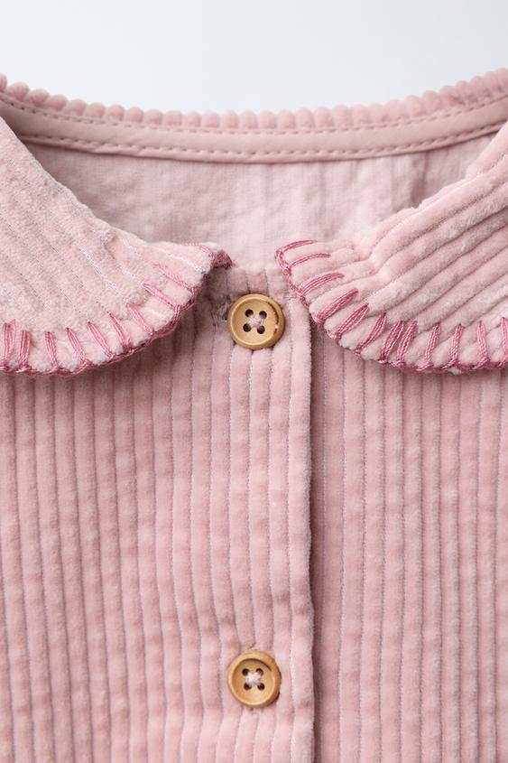 Вельветовое платье с круглым воротником и длинными рукавами на резинке. Застегивается на пуговицы спереди.