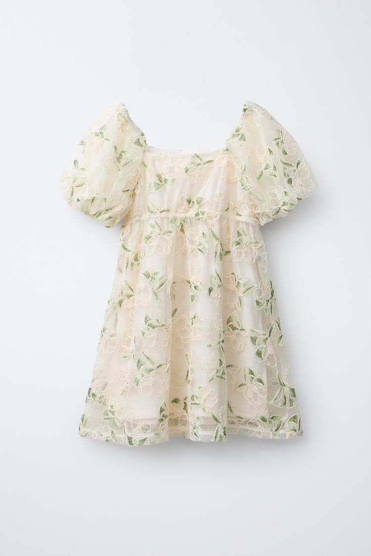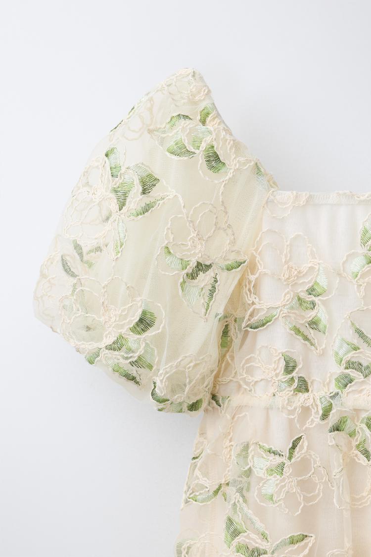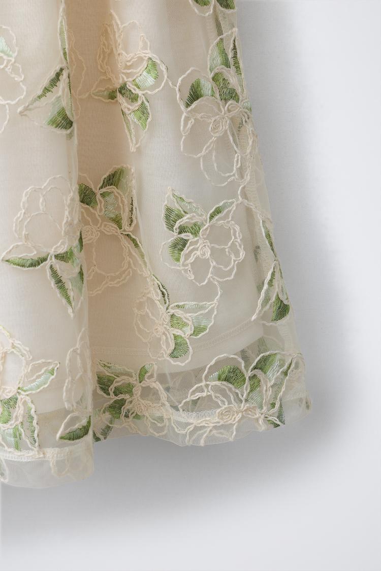 ZARA ПЛАТЬЕ ИЗ ПОЛУПРОЗРАЧНОЙ ТКАНИ С ВЫШИВКОЙ, ЗЕЛЕНЫЙ/ЭКРЮ