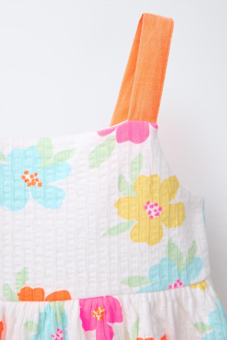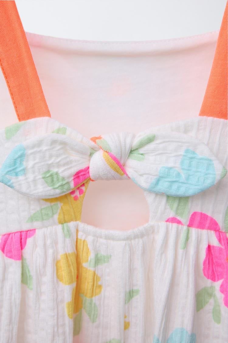 Платье с квадратным вырезом и бретелями. Вырез сзади с бантом. Принт по всему изделию. Изготовлено из 96% хлопка.
